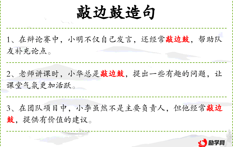 - 每当老师讲课,小华都会敲边鼓,提出一些引人入胜的问题,使得课堂更加生动。