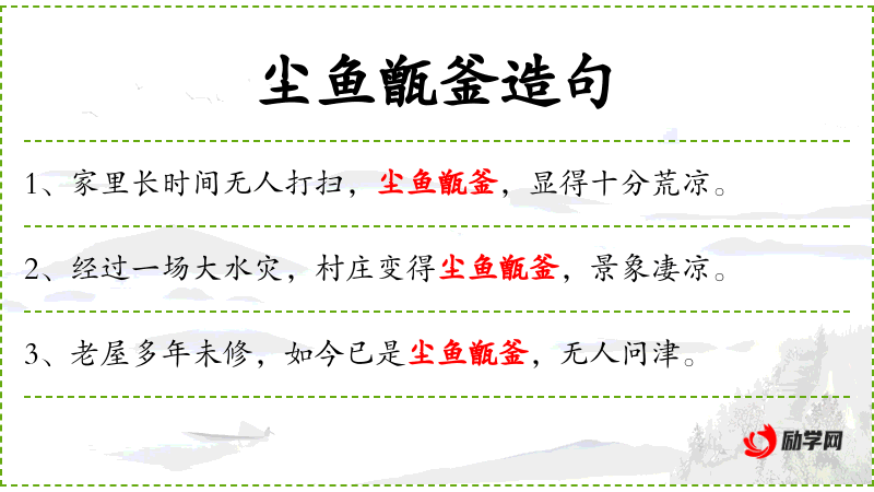 句子:“家里长时间无人打扫,尘鱼甑釜,显得十分荒凉。”