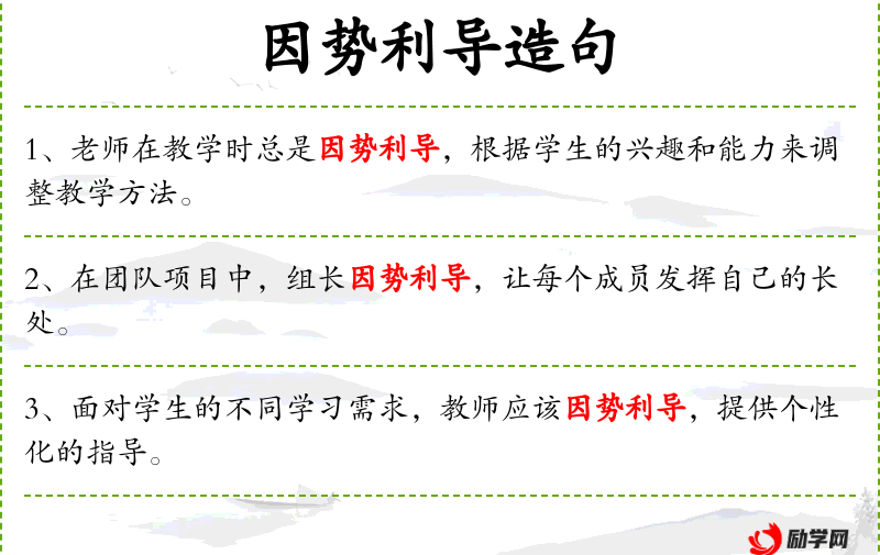 - 因势利导:根据情况灵活引导,是一个成语,强调根据实际情况采取相应措施。