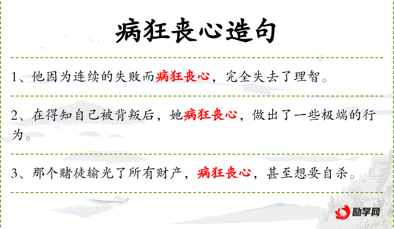 5. 【病狂丧心】 - 狂:疯狂;丧:丧失。丧失理智,像发了疯一样。形容言行昏乱而荒谬。