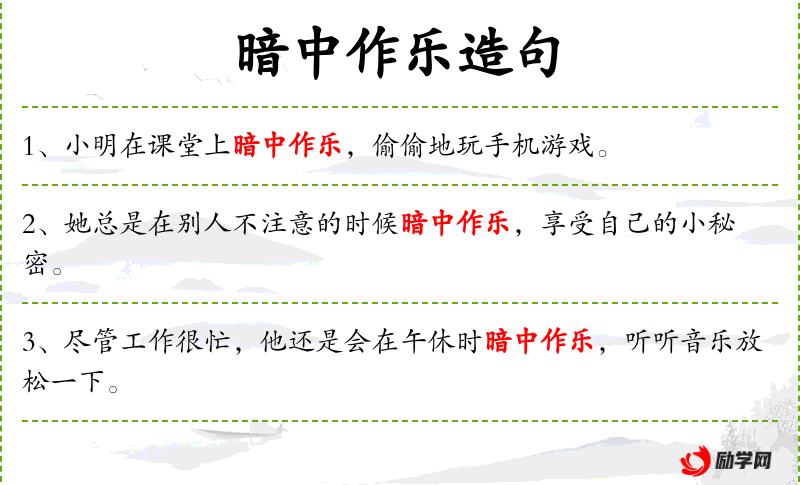 1. 【暗中作乐】 - 暗中:背后,偷偷地。暗地里寻找快乐。