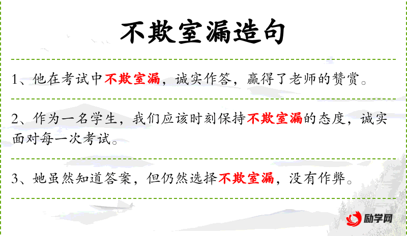 - 不欺室漏:指不隐瞒错误或缺点,坦诚面对。