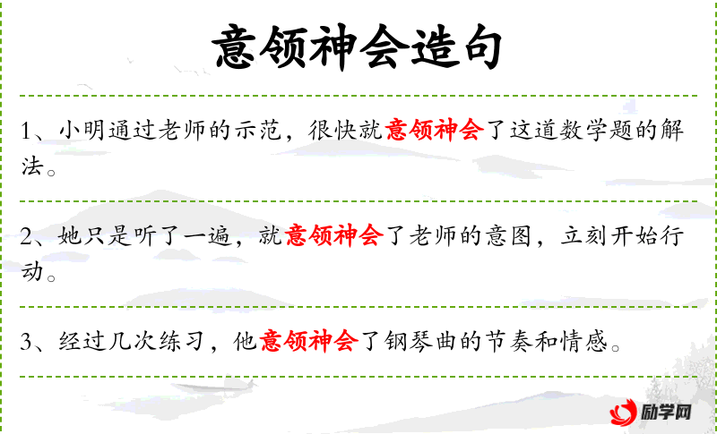 1. 【意领神会】 领、会:领悟,理解。指对方没有明说,心里已经领会。
