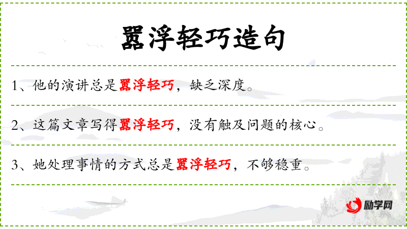 - 嚣浮轻巧:形容词短语,意指表面上看起来轻松、不切实际或不严肃。