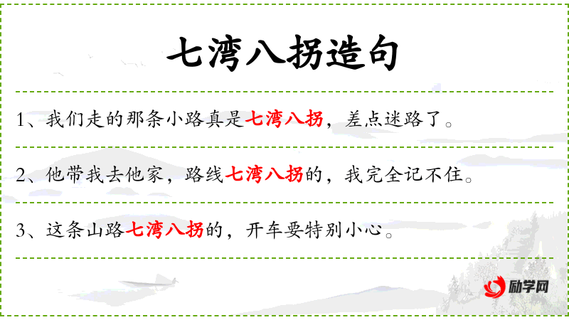 1. 【七湾八拐】 - ①多处弯曲,不断转变方向。②形容做事不直截了当。亦作“七弯八拐”。