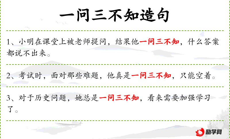 1. 【一问三不知】 - 原意是对某一事情的开始、发展、结果都不知道,现在用来表示对实际情况一点也不知道。