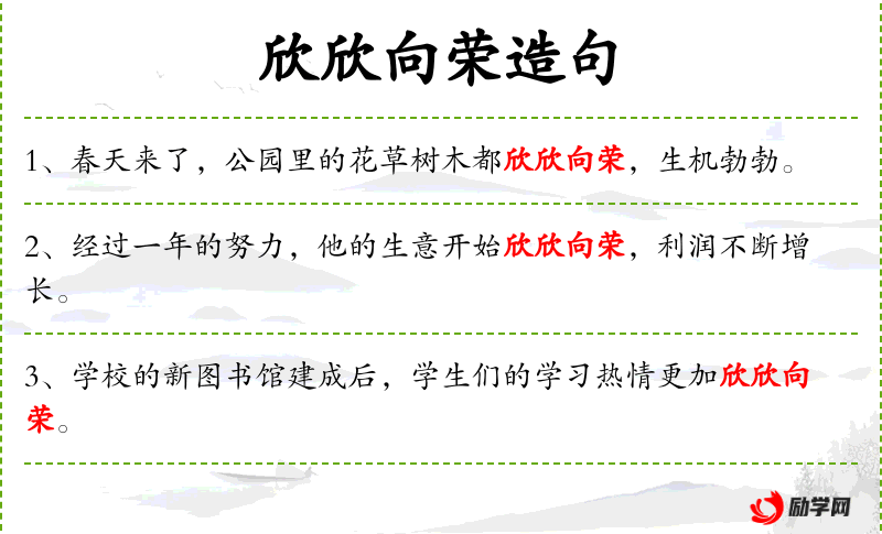 3. 【欣欣向荣】 - 欣欣:形容草木生长旺盛;荣:茂盛。形容草木长得茂盛。比喻事业蓬勃发展,兴旺昌盛。
