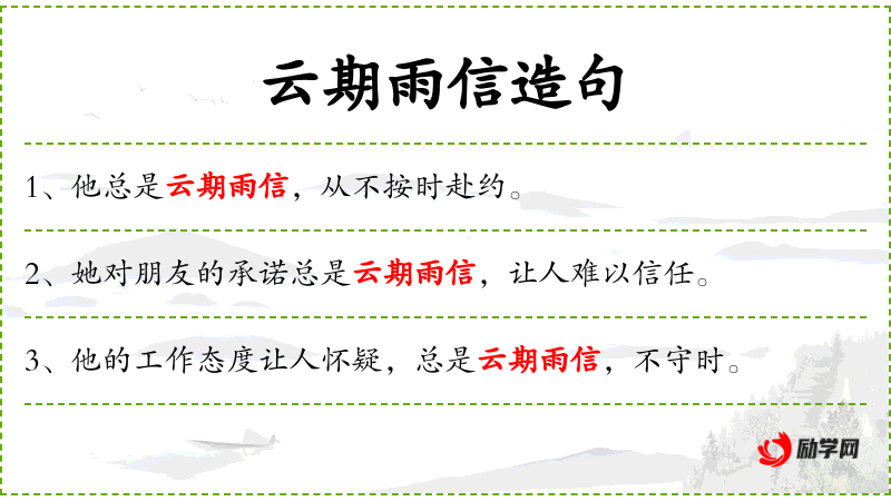 - 云期雨信:这个成语源自**古代,用来形容人不守信用,不按时履行承诺。在现代汉语中,这个成语仍然被用来批评那些不守时的人。