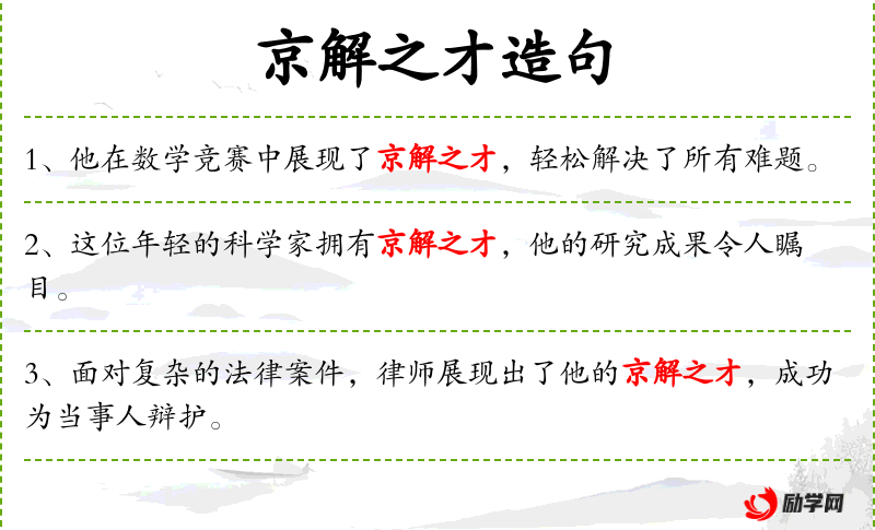 句子:“他在数学竞赛中展现了京解之才,轻松解决了所有难题。”