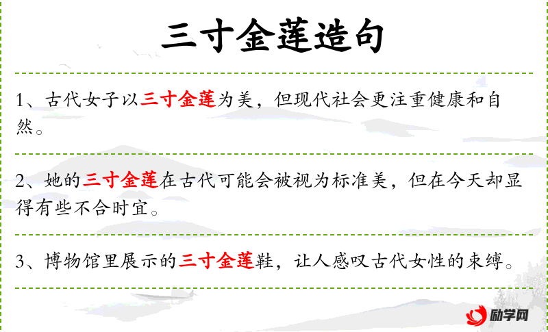 1. 【三寸金莲】 金莲:旧指女子缠过的小脚。封建时代美誉妇女小脚的用语。