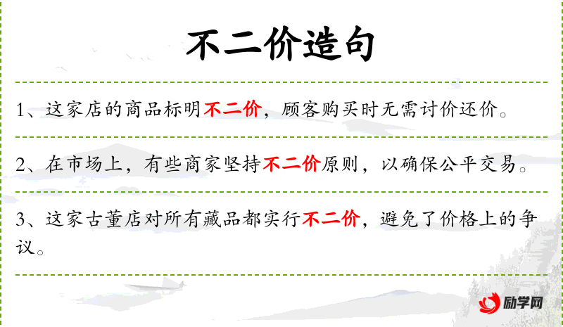 1. 【不二价】 - 定价划一,卖给谁都是一样的价钱:童叟无欺,言~。
