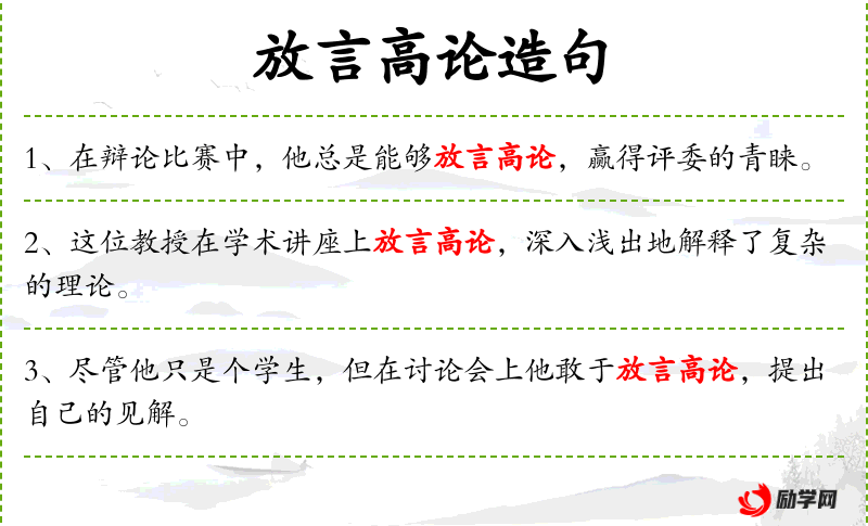 - 放言高论:大胆发表言论,通常指有深度或影响力的言论。