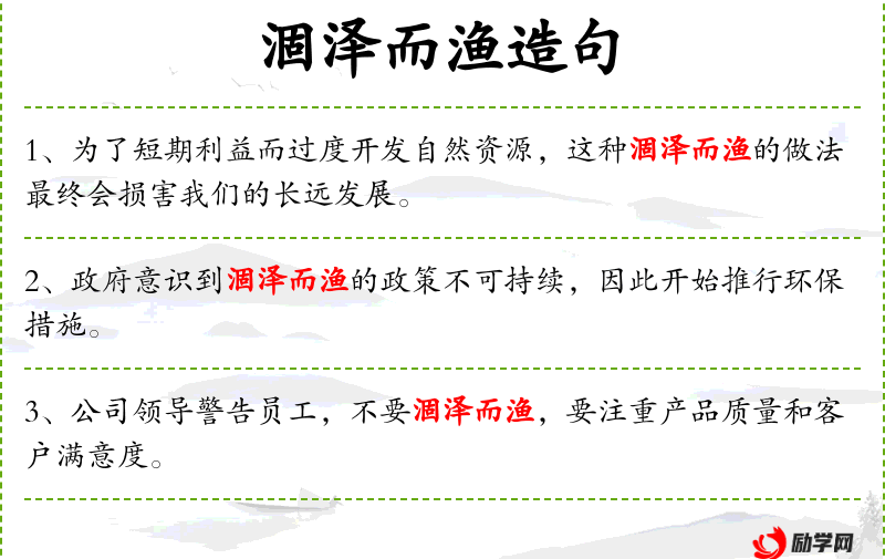 4. 【涸泽而渔】 - 抽干池水捉鱼。比喻只图眼前利益,不作长远打算。