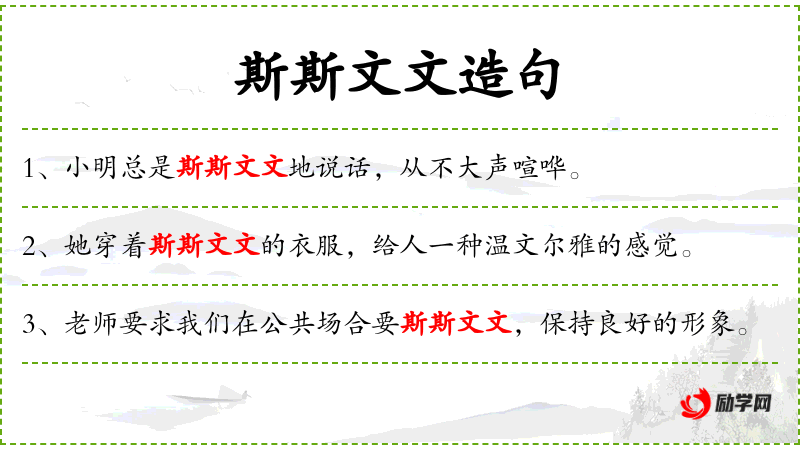 - 斯斯文文地:形容词短语,形容行为举止文雅、有教养。