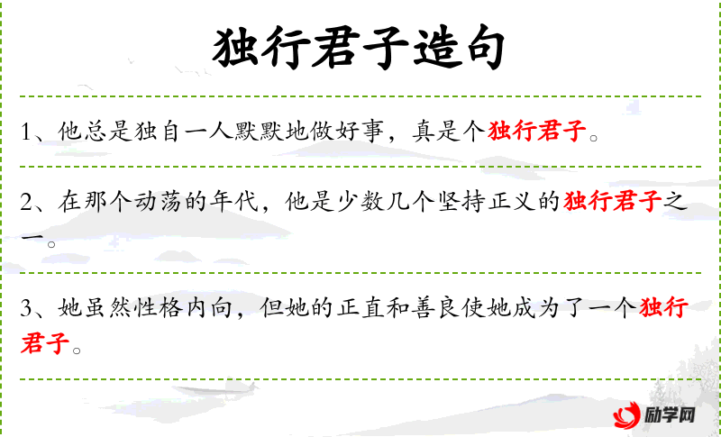 1. 【独行君子】 - 旧指士大夫的独特行为、操守,是一种美称。