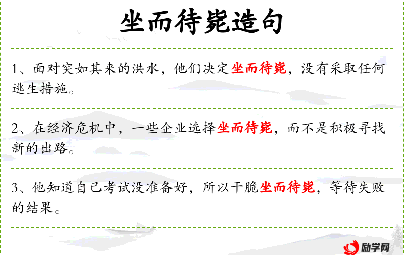 - 坐而待毙:成语,表示无所作为地等待失败。