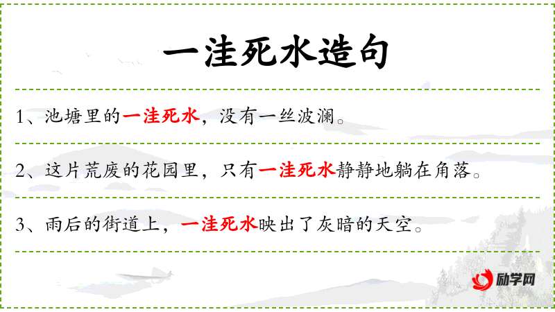 1. 【一洼死水】 - 洼:水坑。一池子死水。比喻停滞不前的沉闷局面。