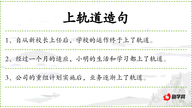 3. 【轨道】 用条形的钢材铺成的供火车、电车等行驶的路线; 天体在宇宙间运行的路线。也叫轨迹; 物体运动的路线,多指有一定规则的,如原子内电子的运动和人造卫星的运行都有一定的轨道; 行动应遵循的规则、程序或范围生产已经走上~。