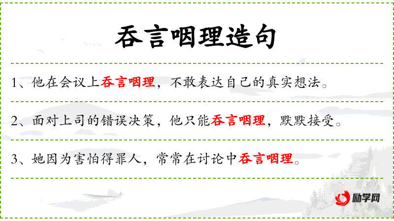 - 吞言咽理:swallow one's words and reasoning, silently accept