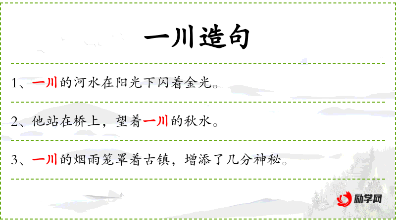 1. 【一川】 - 一条河流; 一片平川;满地。多用于形容自然景色。