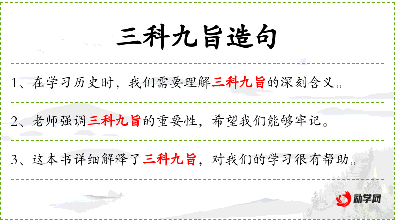 1. 【三科九旨】 汉代《公羊》学家谓《春秋》书法有三科九旨。即于三段中寓九种旨意。有何休﹑宋衷二说。《公羊传.隐公元年》"隐公第一"唐徐彦疏"问曰'《春秋说》云《春秋》设三科九旨,其义如何?'答曰'何氏(何休)之意以为三科九旨,正是一物。若搆言之,谓之三科,科者,段也;若析而言之,谓之九旨,旨者,意也,言三个科段之内,有此九种之意。故何氏作《文谥例》云三科九旨者,新周﹑故宋,以《春秋》当新王,此一科三旨也。又云所见异辞,所闻异辞,所传闻异辞,二科六旨也。又内其国而外诸夏,内诸夏而外夷狄,是三科九旨也。'问曰'案宋氏(宋衷)之注《春秋说》,三科者 2.一曰张三世,二曰存三统,三曰异外内,是三科也;九旨者,一曰时,二曰月,三曰日,四曰王,五曰天王,六曰天子,七曰讥,八曰贬,九曰絶。'"按三世指夏﹑殷﹑周,三统指夏为人统,殷为地统,周为天统;时﹑日﹑月,指记述的详略;王﹑天王﹑天子,指称谓的远近亲疏讥﹑贬﹑绝,指书法的轻重。