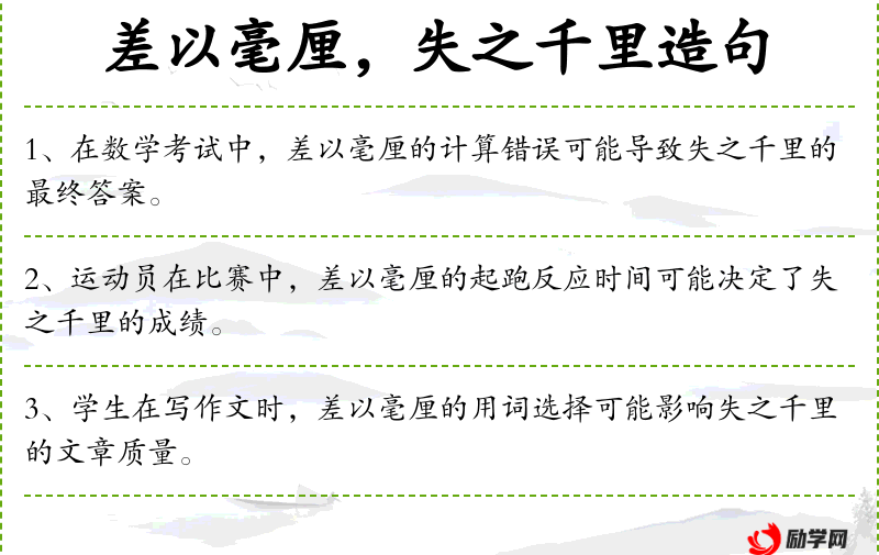 - 状语:在实验中、差以毫厘的测量误差、失之千里的