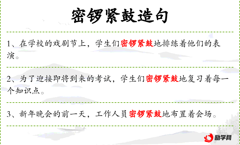 - 密锣紧鼓:形容事情进行得紧张而忙碌。