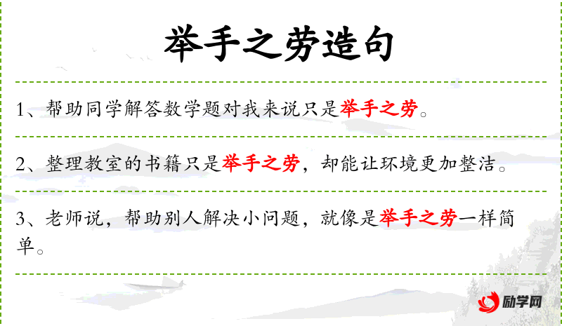 1. 【举手之劳】 一举手那样的辛劳。形容轻而易举,毫不费力。