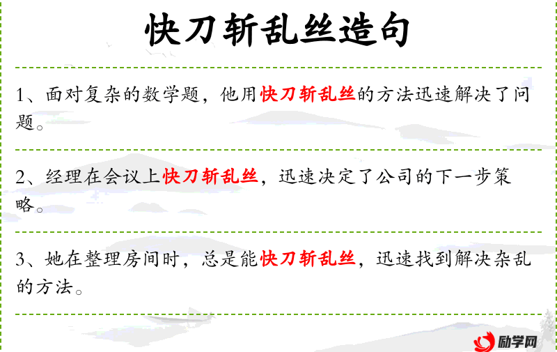 - 快刀斩乱丝:源自希腊神话中的Gordian Knot,比喻迅速而有效地解决问题。