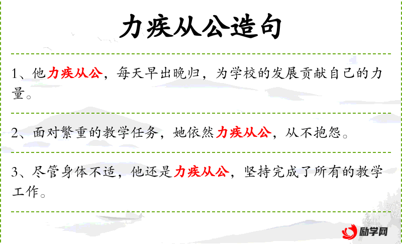 2. 【力疾从公】 力疾:带病坚持;从公:从事公务。形容克服病痛,坚持工作。
