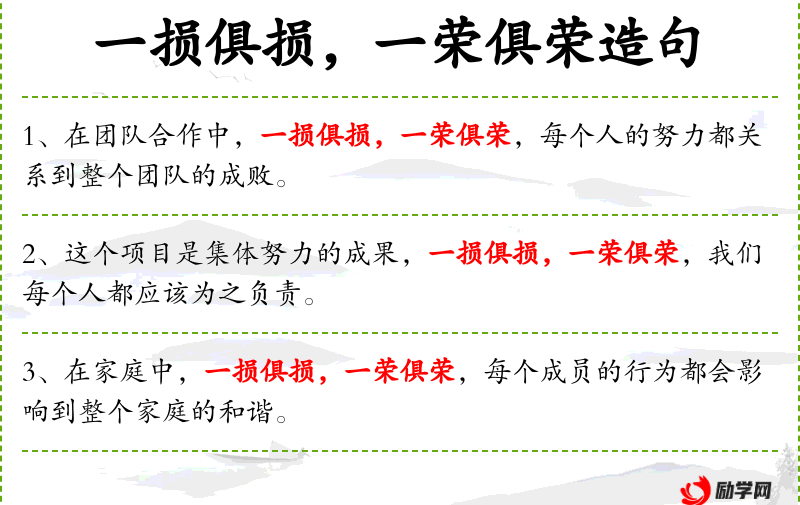 - 一损俱损,一荣俱荣:这是一个成语,意思是如果一方受损,另一方也会受损;如果一方受益,另一方也会受益。强调合作中的相互依赖性。