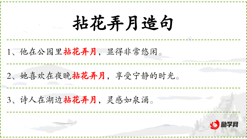 - 拈花弄月:这个成语源自**古代文人的生活情趣,反映了他们对自然美的欣赏和对精神世界的追求。