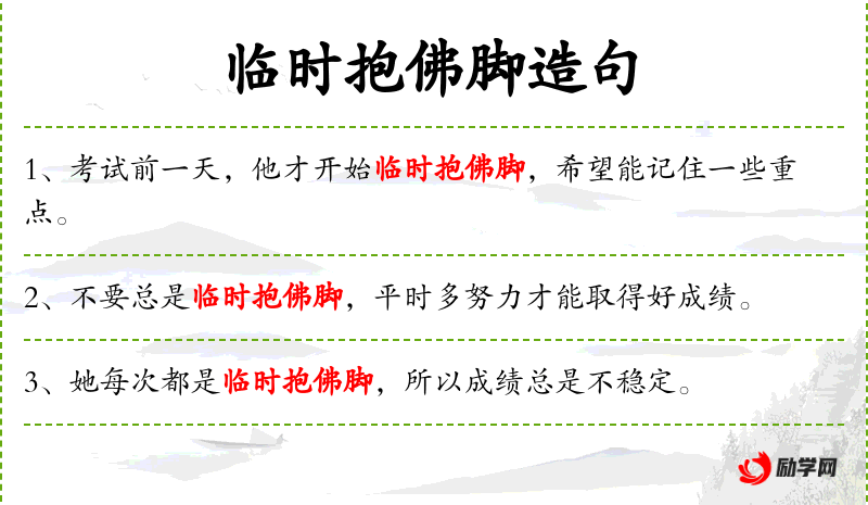 - 临时抱佛脚:成语,比喻在紧急情况下匆忙应付,不做长期准备。