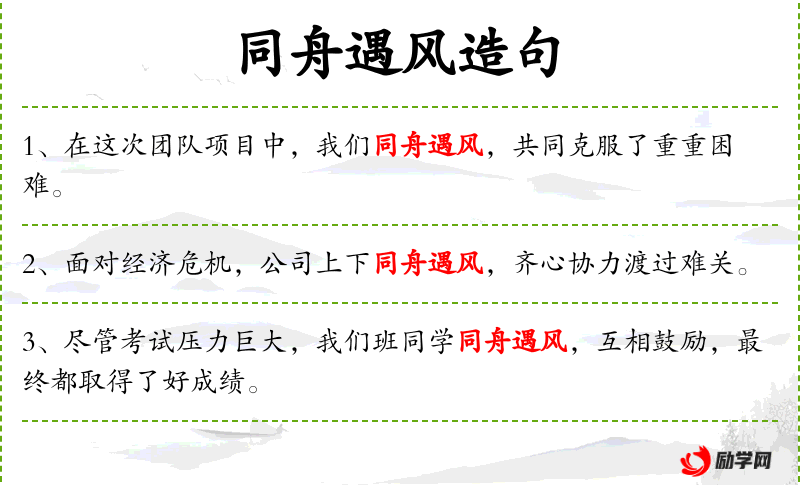 - 同舟遇风:这个成语源自《左传·僖公二十八年》,比喻在困难时团结一致,共同应对挑战。
