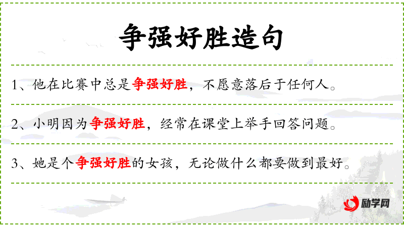 1. 【争强好胜】 争:争夺;强:优胜;好:喜爱。争为强者,事事处处都喜欢超过和压倒别人。