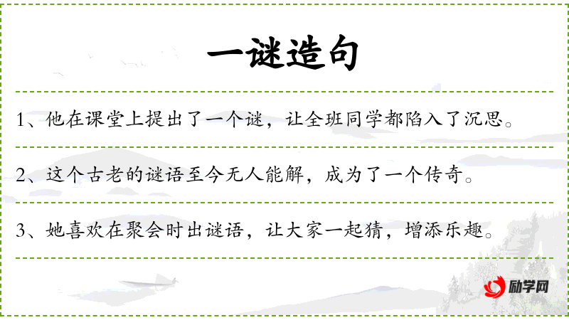 6. 【谜语】 古称隐语”。文字游戏。通常以事、物或诗句、成语、俗语、人名、地名、典故等文字为谜底,以隐喻、暗示、形似或描写其特征等为谜面,供人猜射。