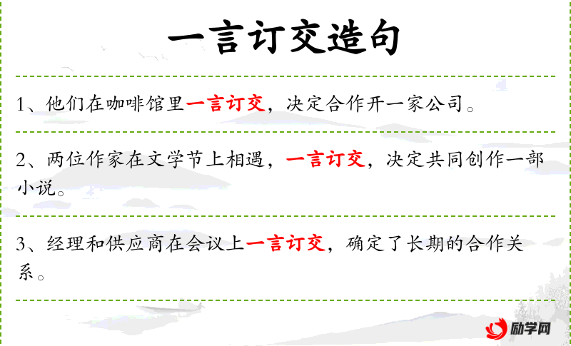1. 【一言订交】 形容双方意气相投,刚一交谈,就成了至交。