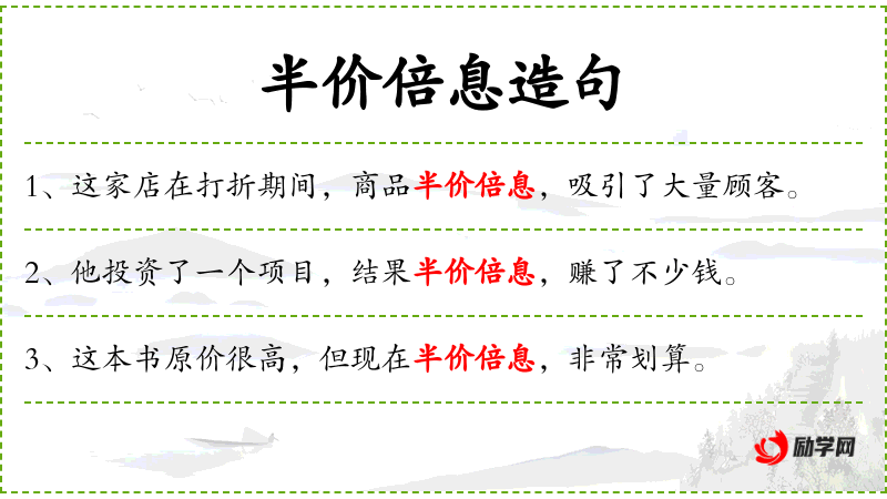 句子中提到的“半价倍息”可能涉及特定的促销活动或金融产品。了解相关的文化背景和市场习俗有助于更准确地理解句子的含义。
