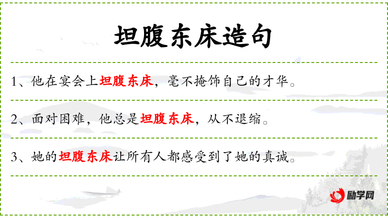 - 谓语:坦腹东床,毫不掩饰