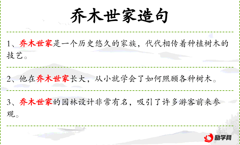 句子:“乔木世家的传统节日总是围绕着树木的种植和养护进行。”