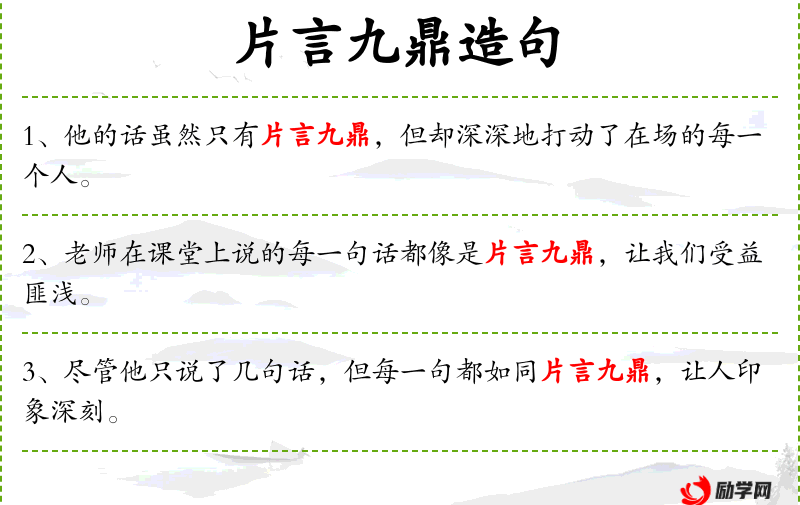 2. 【片言九鼎】 - 九鼎:古代国家的宝器,象征九州。比喻说话力量大,能起很大作用或指人说话十分守信。