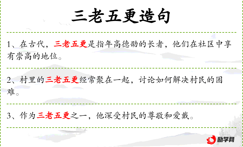 - “重阳节到来时,村里总是会邀请三老五更参与庆祝活动。”