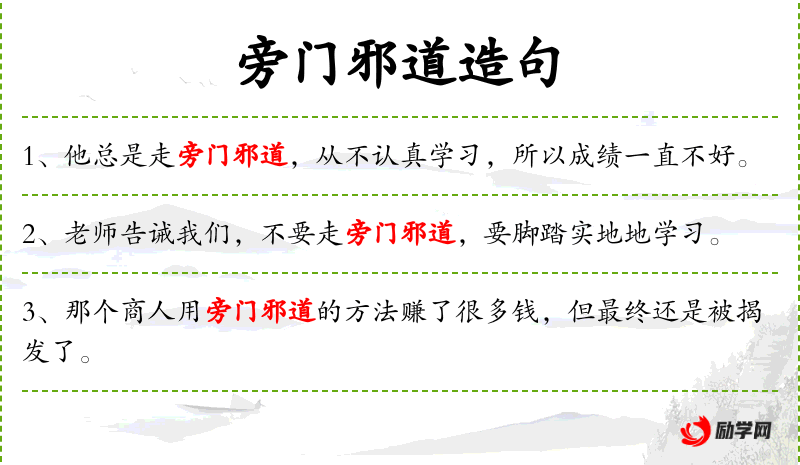 - 旁门邪道:指不正当或不合法的方法,与“正道”相对。