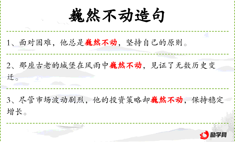 5. 【巍然不动】 巍然:高大的样子。形容高大坚固,不可动摇。