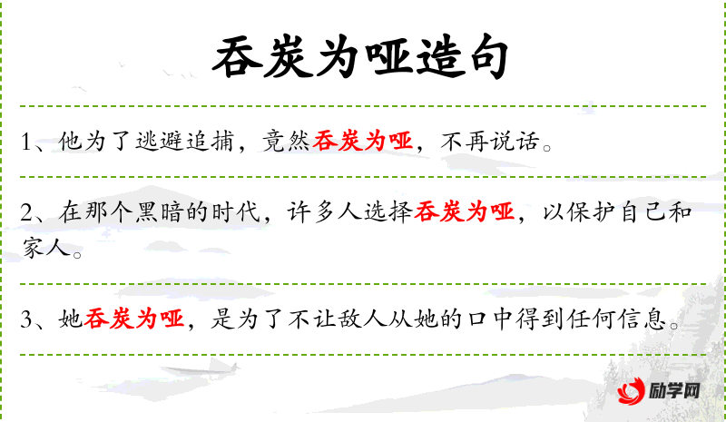 1. 【吞炭为哑】 吞炭:喉咙吞炭使哑。指故意改变声音,使人不能认出自己。