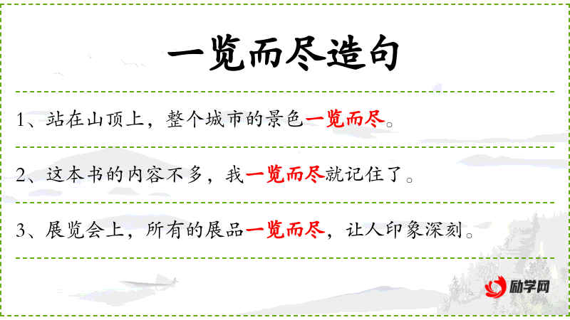 - 一览而尽:成语,意思是看一眼就能完全理解或掌握。