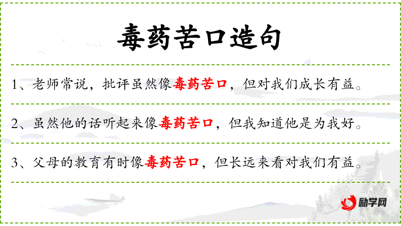 3. 【毒药苦口】 - 毒药:攻毒的药物。比喻尖锐的批评虽然像毒药一样苦口难服,却能让人醒悟。
