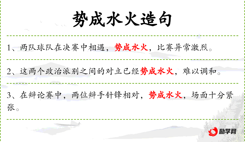 1. 【势成水火】 形容双方就像水火一样互相对立,不能相容。