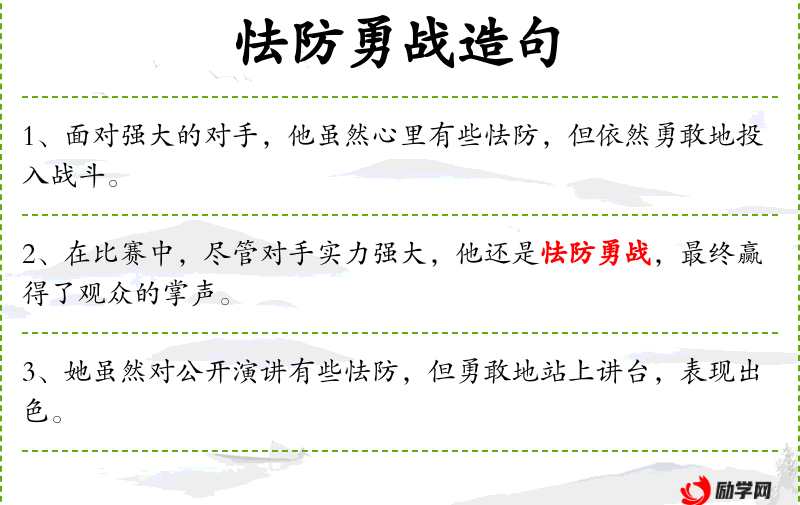 - 尽管对对手的速度感到怯防,他仍然在体育比赛中勇敢地迎战。