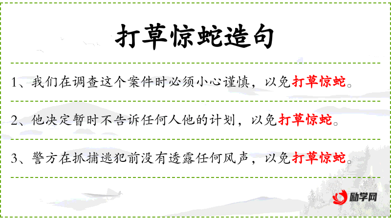 - 打草惊蛇:成语,比喻采取行动时惊动了对方,使其有所防备。